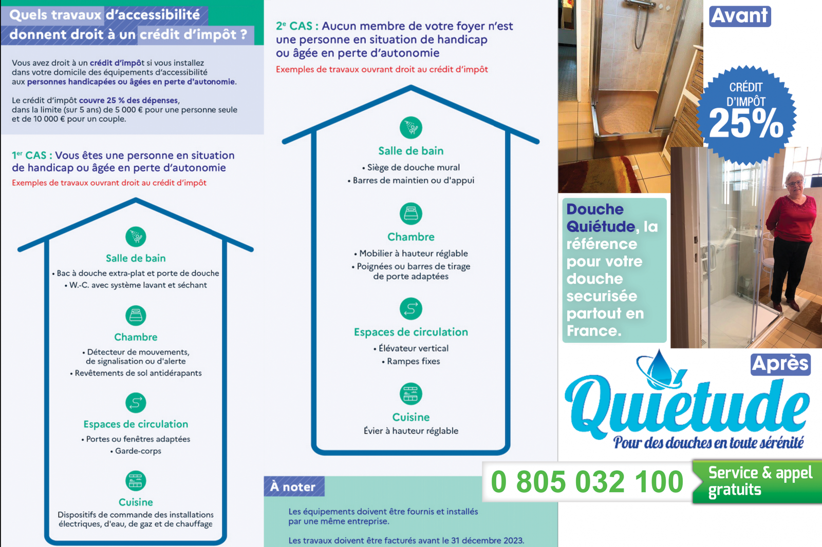 Un crédit d'impôt est également un montant déduit de vos impôts. Contrairement aux déductions fiscales, les crédits d'impôt sont remboursés en tout ou en partie lorsque son montant dépasse votre impôt et même lorsque vous êtes non imposable.En tant que senior et PMR, vous pouvez bénéficiez d'un crédit d'impôt à hauteur de 25% si vous effectuez des travaux d'appareillage à domicile. Les conditions ?