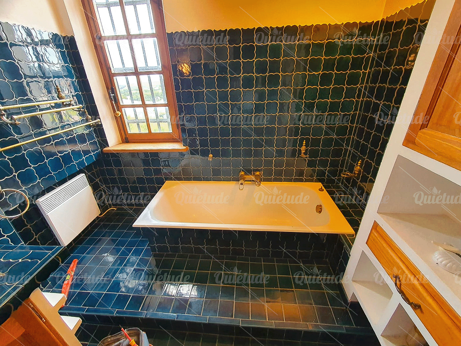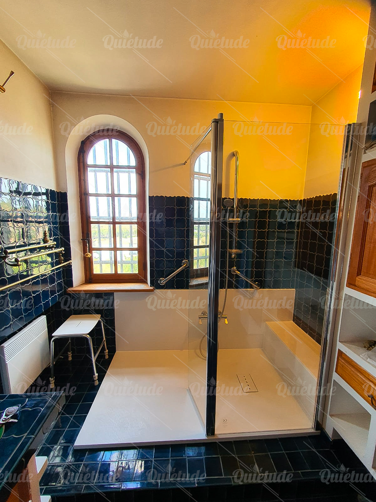 Douche Quiétude s'est occupé des travaux de sécurisation dans la maison de ce couple Niçois âgés de 76 et 82 ans. Pour cette belle salle de bain aux murs et sols carrelés bleus, Quiétude a installé un immense receveur à l'italienne avec la résistance à la glissance la plus élevée, la PN24 (cf Qu'est-ce la résistance PN24).
