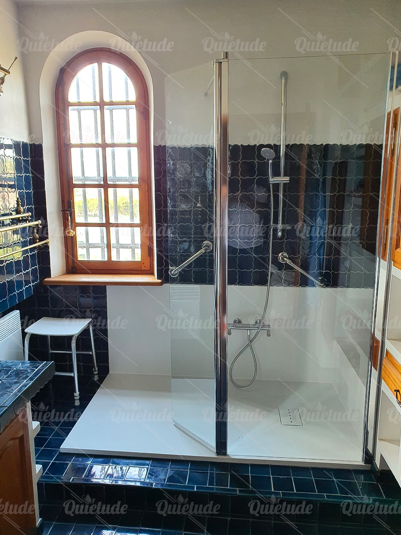 Douche Quiétude allie l'esthétisme et la sécurité. Cette douche sur mesure réalisée en 1 journée s'harmonise avec son espace offrant à cette magnifique salle de bain, une touche de modernité.