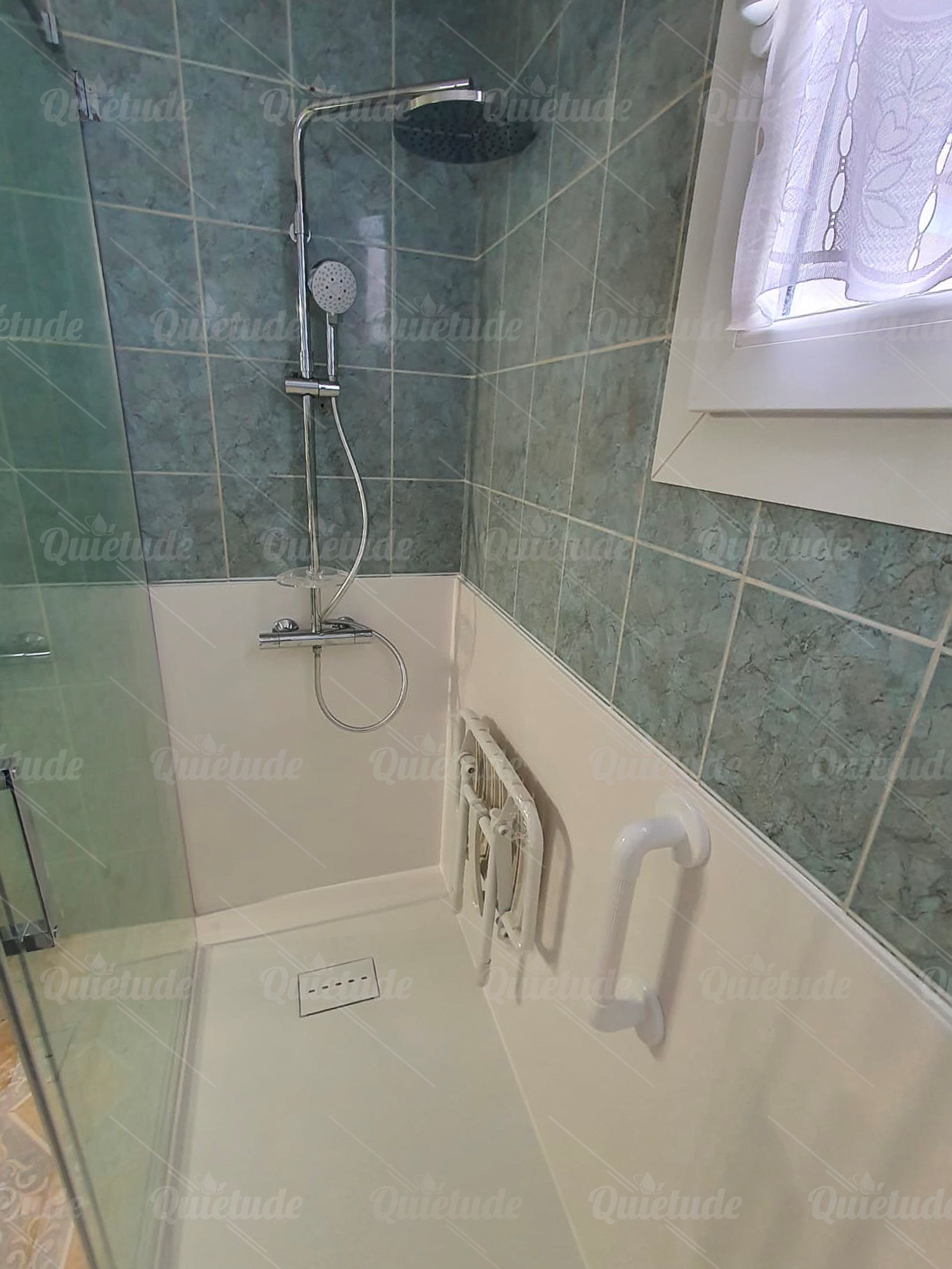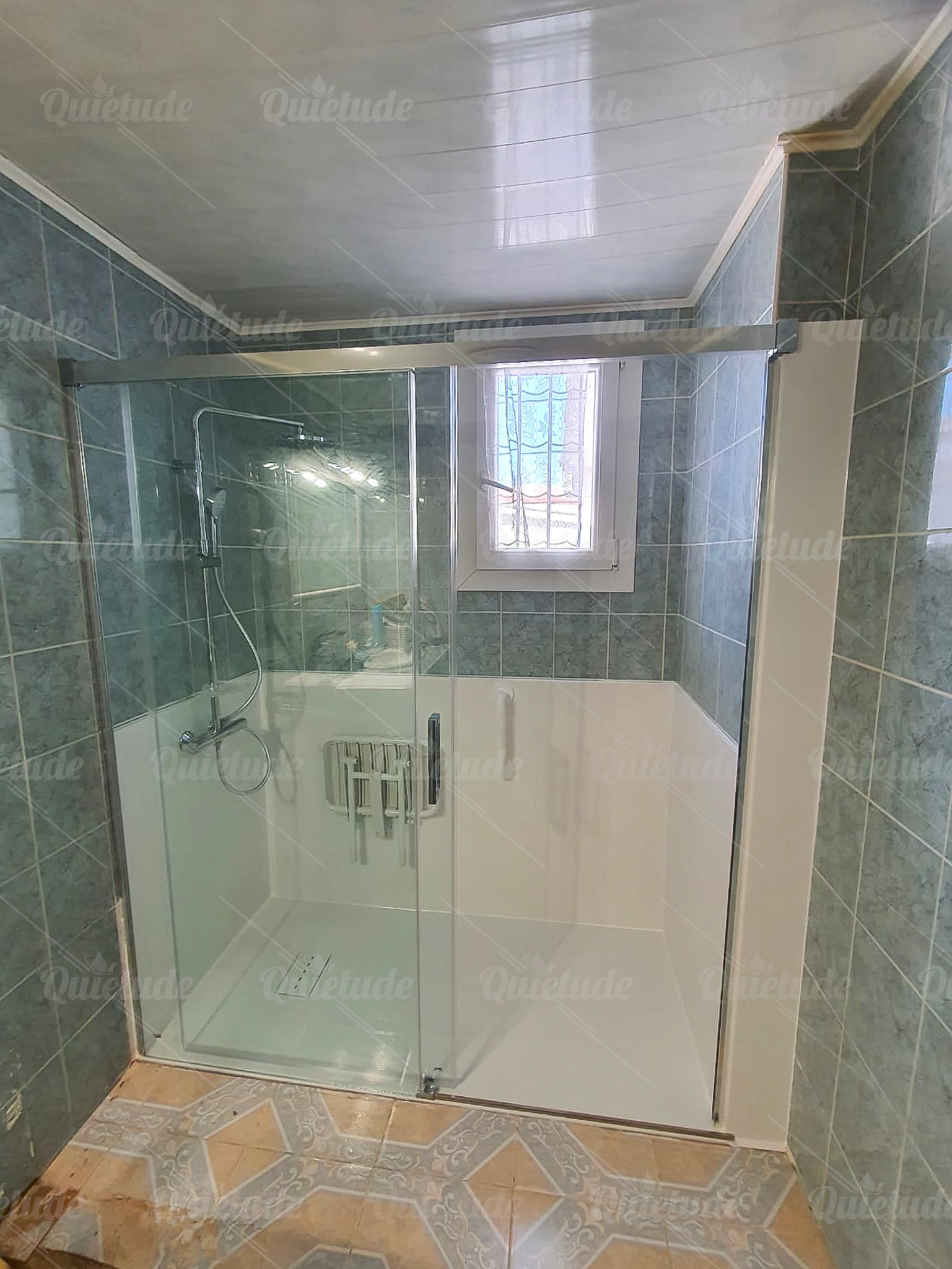 Pour cette belle salle de bain vert d'eau, Quiétude a posé une douche ultra sécurisée antidérapante pour ce couple de 72 et 74 ans habitant à Montpellier. Quiétude a également fait disparaître l'ancien bidet et a fait installé des parois coulissantes en verre securit 8 mm traitées anti-calcaire.