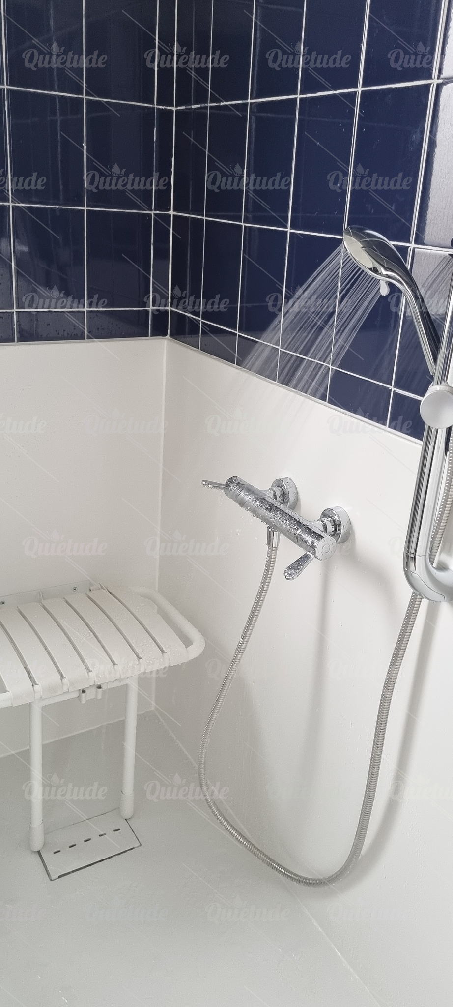 Quiétude, c'est un concept clé en main : un rendez-vous avec votre technicien conseil avec une étude de vos besoins et un devis gratuit. Une journée de travaux comprenant l'enlèvement de votre ancienne baignoire, la réfection de la plomberie, l'installation de la nouvelle douche et ses accessoires personalisables, le nettoyage et le service après-vente.
